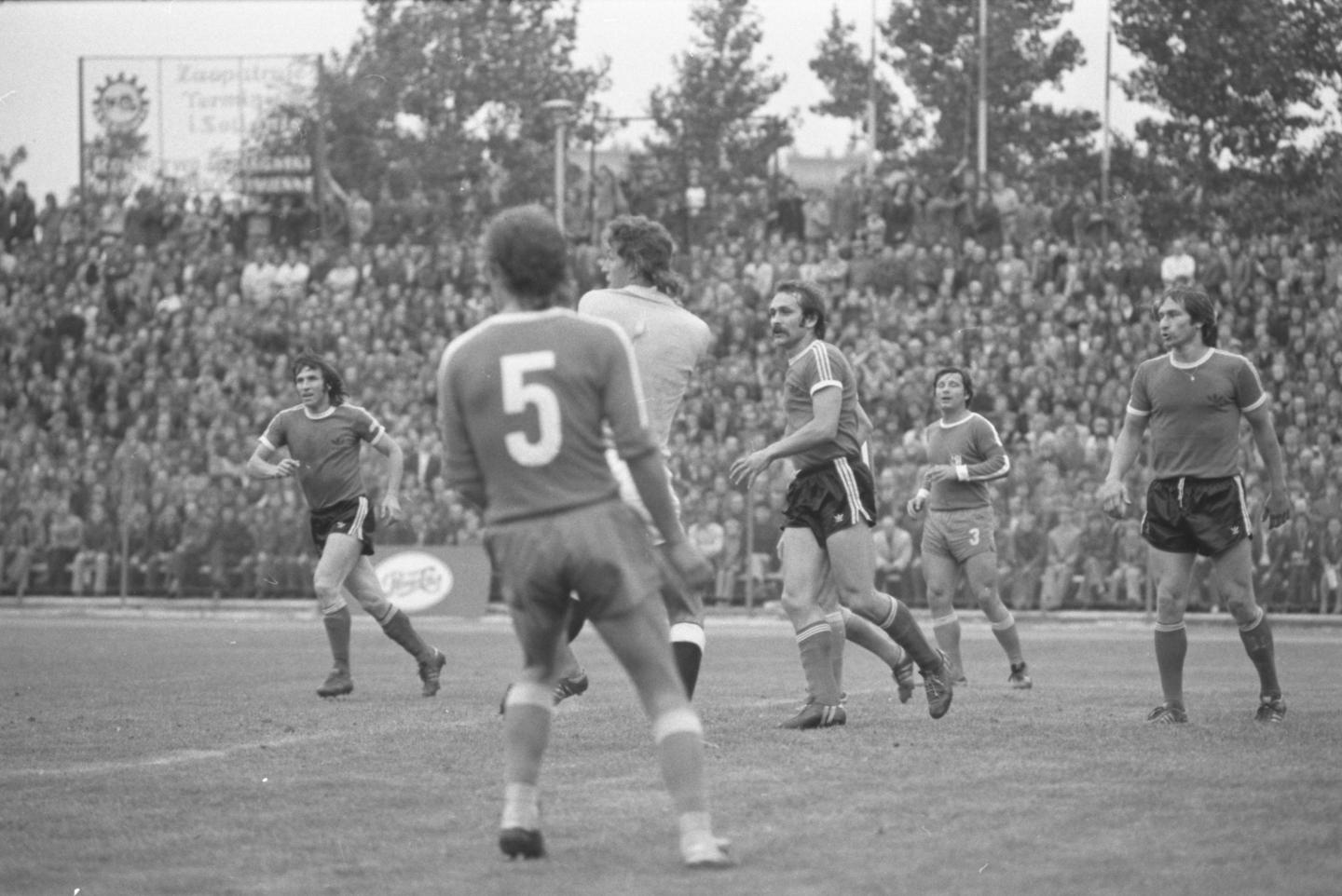 Klaus Decker (nr 5) był tym piłkarzem gości, od którego w końcówce 1. połowy odbiła się piłka i wpadła do bramki obok bezradnego Dirka Heynego.