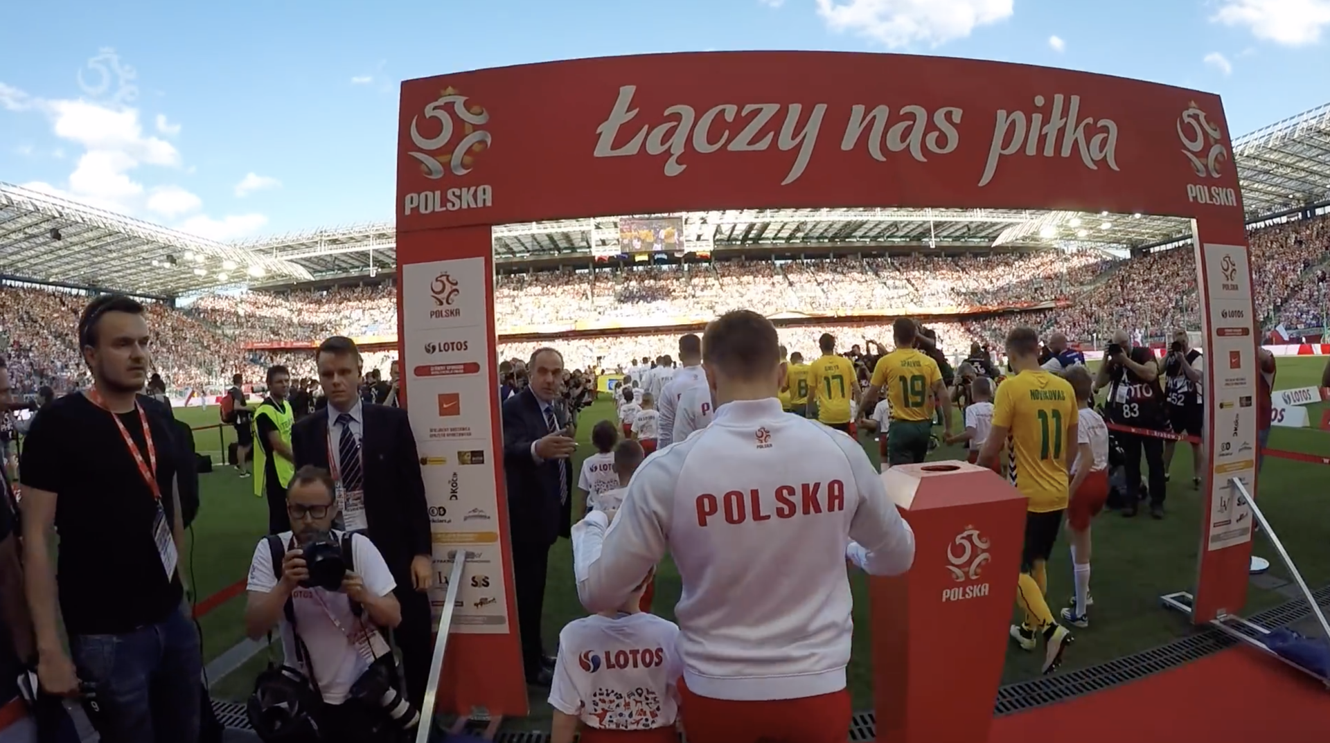 Reprezentacja Polski przed meczem z Litwą. W górnym rzędzie od lewej: Grzegorz Krychowiak, Filip Starzyński, Thiago Cionek, Jakub Wawrzyniak, Kamil Glik (kapitan), Łukasz Fabiański. W dolnym rzędzie od lewej: Bartosz Kapustka, Krzysztof Mączyński, Jakub Błaszczykowski, Kamil Grosicki, Arkadiusz Milik.