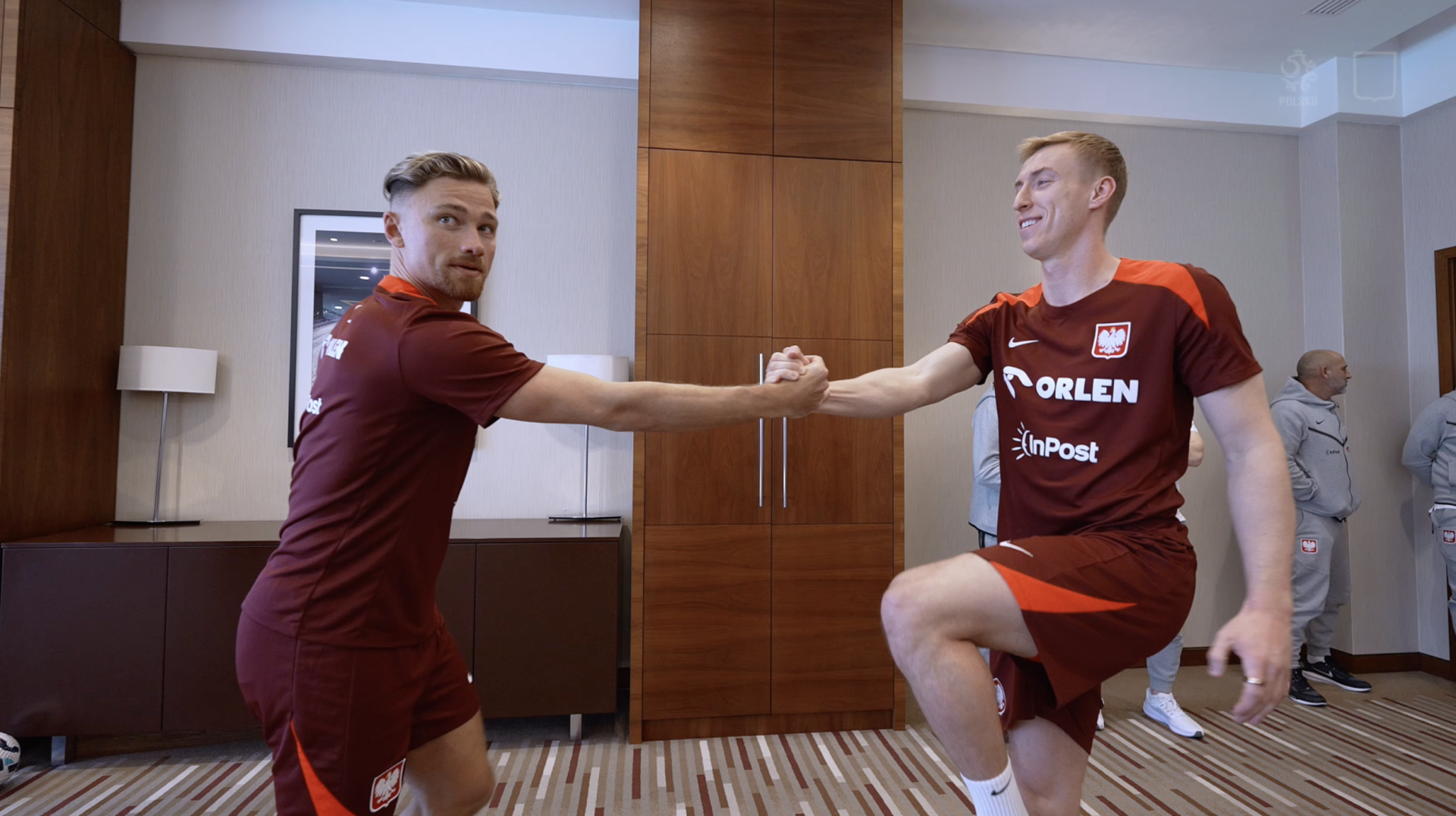 Reprezentacja Polski przed meczem z Litwą. W górnym rzędzie od lewej: Jakub Moder, Karol Świderski, Jakub Kiwior, Łukasz Skorupski, Jan Bednarek, Kamil Piątkowski. W dolnym rzędzie od lewej: Matty Cash, Robert Lewandowski (kapitan), Przemysław Frankowski, Sebastian Szymański, Jakub Piotrowski.