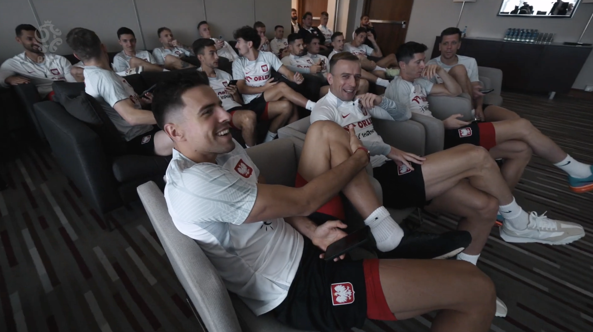 Reprezentacja Polski przed meczem z Łotwą. W górnym rzędzie od lewej: Łukasz Skorupski, Damian Szymański, Jakub Kiwior, Mateusz Wieteska, Jan Bednarek, Adam Buksa. W dolnym rzędzie od lewej: Sebastian Szymański, Nicola Zalewski, Robert Lewandowski (kapitan), Przemysław Frankowski, Jakub Piotrowski.