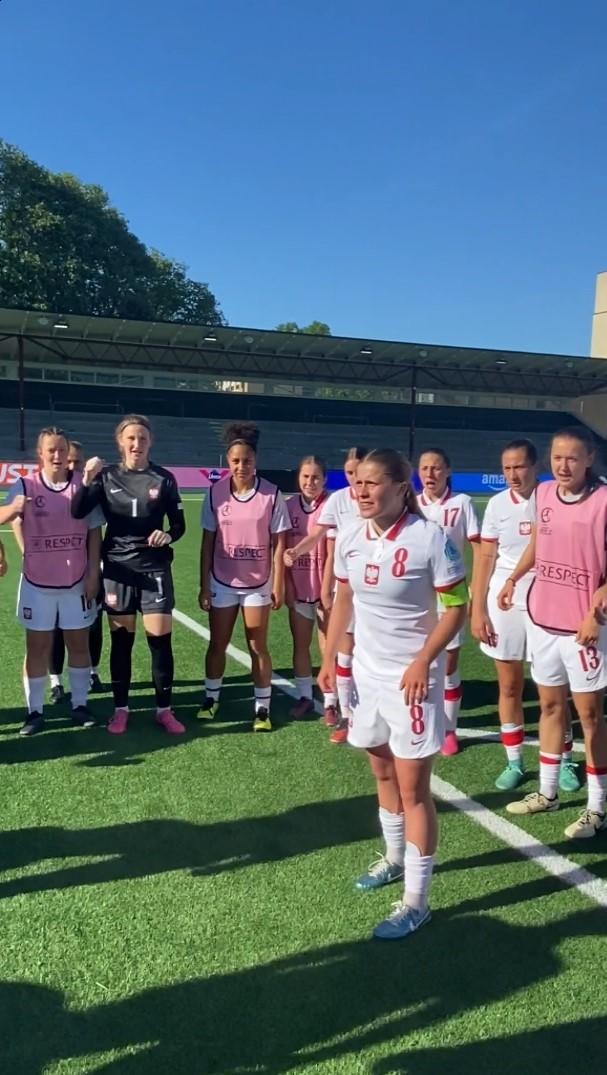 Reprezentacja Polski kobiet do lat 17 przed meczem z Portugalią. W górnym rzędzie od lewej: Julia Woźniak, Iga Witkowska, Weronika Araśniewicz, Magda Piekarska, Oliwia Łapińska, Kinga Wyrwas. W dolnym rzędzie od lewej: Zuzanna Witek (kapitanka), Maja Zielińska, Lena Marczak, Krystyna Flis, Oliwia Związek.
